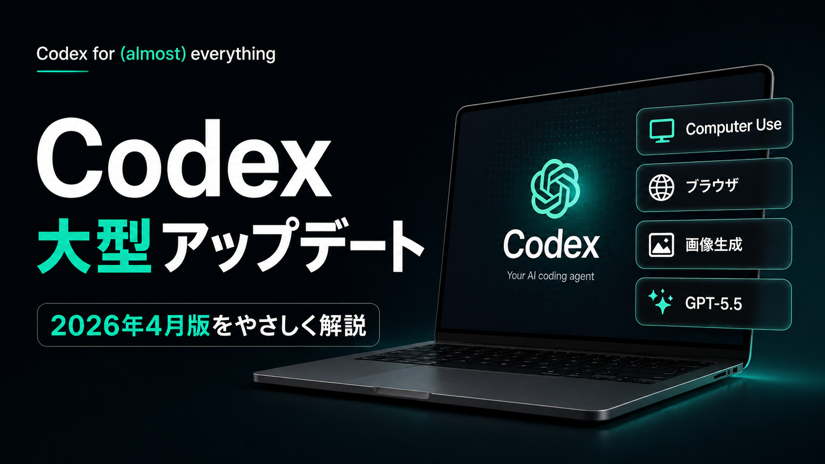 2026年4月16日、OpenAIは「Codex for (almost) everything」と題した大型アップデートを発表しました。これは新しい製品ではなく、既存のCodexアプリに大きな機能追加が行われたものです(出典:OpenAI公式ブログ)。